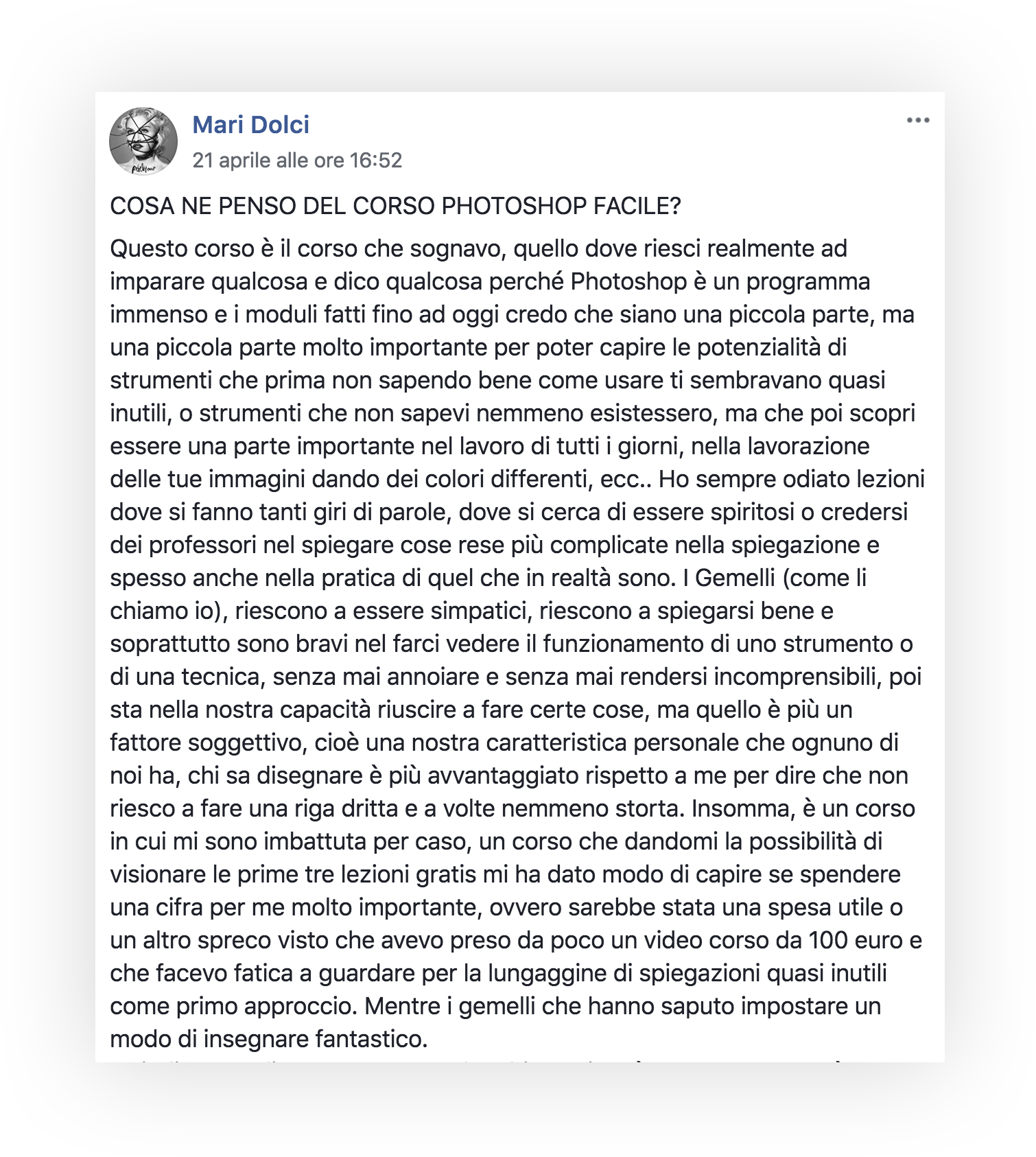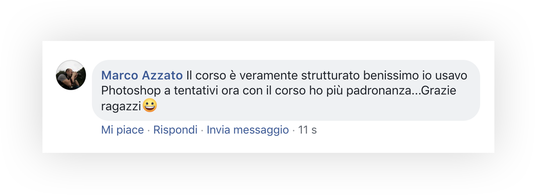 La verità però è tutt'altra! La maggior parte di questi corsi sono pensati e strutturati per farti scucire soldi ogni singolo mese! Addirittura alcuni membri del corso Photoshop Facile che in passato hanno frequentato questi corsi, quando hanno iniziato il corso Photoshop Facile sono rimasti a bocca aperta per le NUOVE tecniche apprese. Insomma mesi e mesi di sbattimenti e “studio” e poi non conosci nemmeno le fondamenta del programma..ma dai. Questi corsi NON funzionano perché si focalizzano molto sulla teoria trascurando del tutto la pratica (si esatto, corsi SPIACCICATI al manuale di Photoshop).